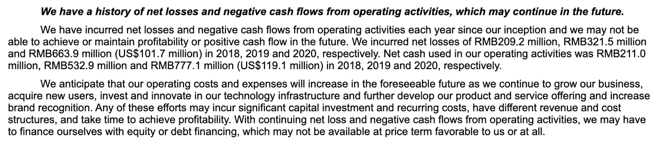 在招股书的风险因素部分,水滴公司亦表示,自成立以来,公司每年都因经营活动而出现净亏损和负现金流,这一状况或将在未来持续下去。