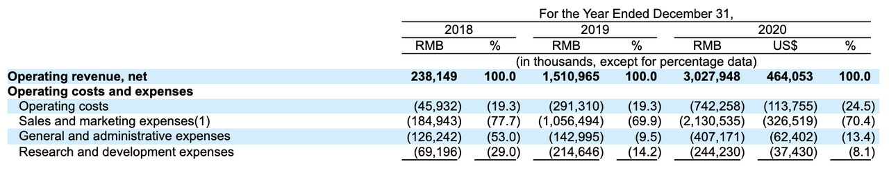 销售及市场费用高企是水滴公司亏损的主要原因。2018年至2020年,水滴公司的销售及市场费用分别为1.85亿元、10.56亿元、21.3亿元,占总收入的比例分别为77.7%、69.9%和70.4%。