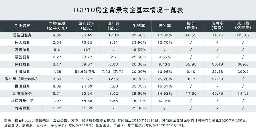 锋面News统计了TOP10及准TOP10在内11家房企背景物企的情况显示,从在管面积的表现上看,截止2020年6月30日,在管面积最多的为万科物业,在管面积达5.2亿平方米;其次是碧桂园服务,达4.05亿平方米;再次是成功吃下了绿地物业的雅生活,达3.53亿平方米。