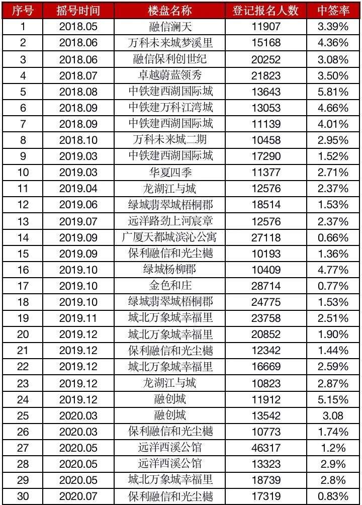 以曾6万人摇的远洋西溪公馆为例,9月再推1213套房源,最终实际登记人数仅为4899户,远未达到“万人摇”的标准,其综合中签率24.8%,相较于5月份最低1.2%的中签率,足足增加了20倍。