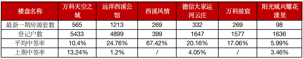 万科天空之城、德信大家运河云庄、万科前宸、远洋西溪公馆等6个红盘项目加推,中签率迅速走高。具体来看,6个项目中只有万科天空之城、阳光城兴耀花漾里两个项目中签率较低,但仍维持在10%左右,其余4个项目中签率均在20%以上,最高的达到了67.42%。从登记户数来看,基本在5000户以下。
