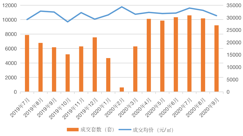 图:2019年7月-2020年9月二手房成交量价月度走势