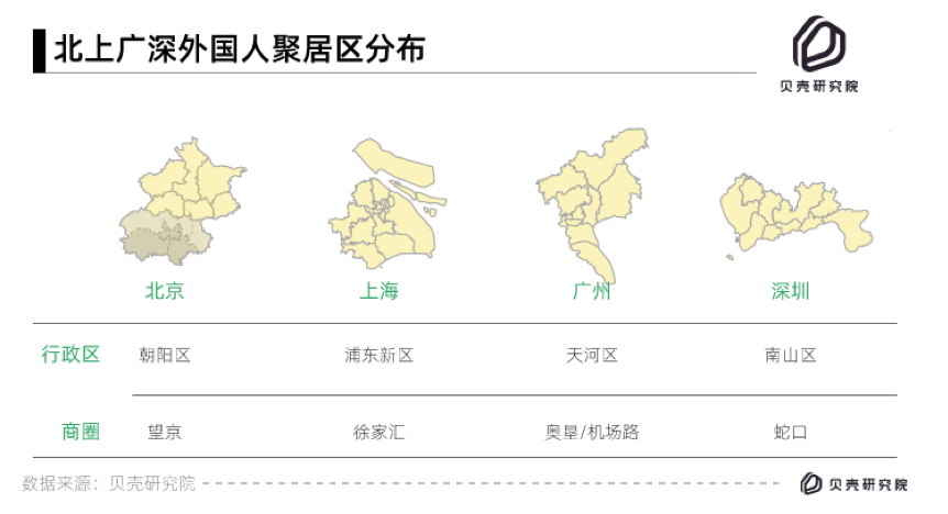 此外,城市内部来看,北望京、南蛇口,东徐家汇、西桐梓林是全国四大外籍人口聚居区。