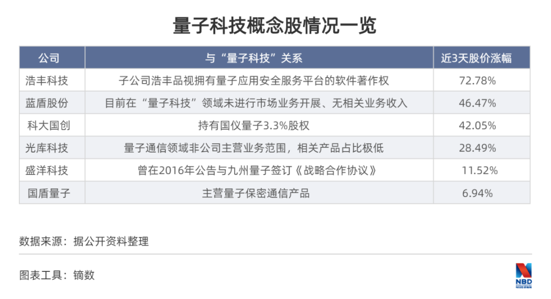 不过,这些被市场冠以“量子科技概念”的股票,却并不被包括张宇在内的券商研究员认同。在与《每日经济新闻》记者交流中,当被问及量子科技板块所涉及企业时,张宇直言,“除了国盾量子外,其他都是偏概念,所以不太方便评价。”