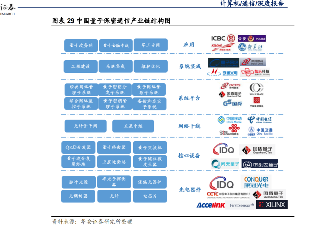 未来传统加密算法将随着量子计算机的出现变得脆弱,量子通信的多种特效也决定了其无法被窃听。在量子通信产业化方面,我国目前形成了以潘建伟院士等学科领头人为代表创立的多家量子通信企业,和以合肥为代表的量子通信产业集群,拥有完整的量子通信产业链,核心设备供应商出现了国盾量子、问天量子、中创为等多家公司。