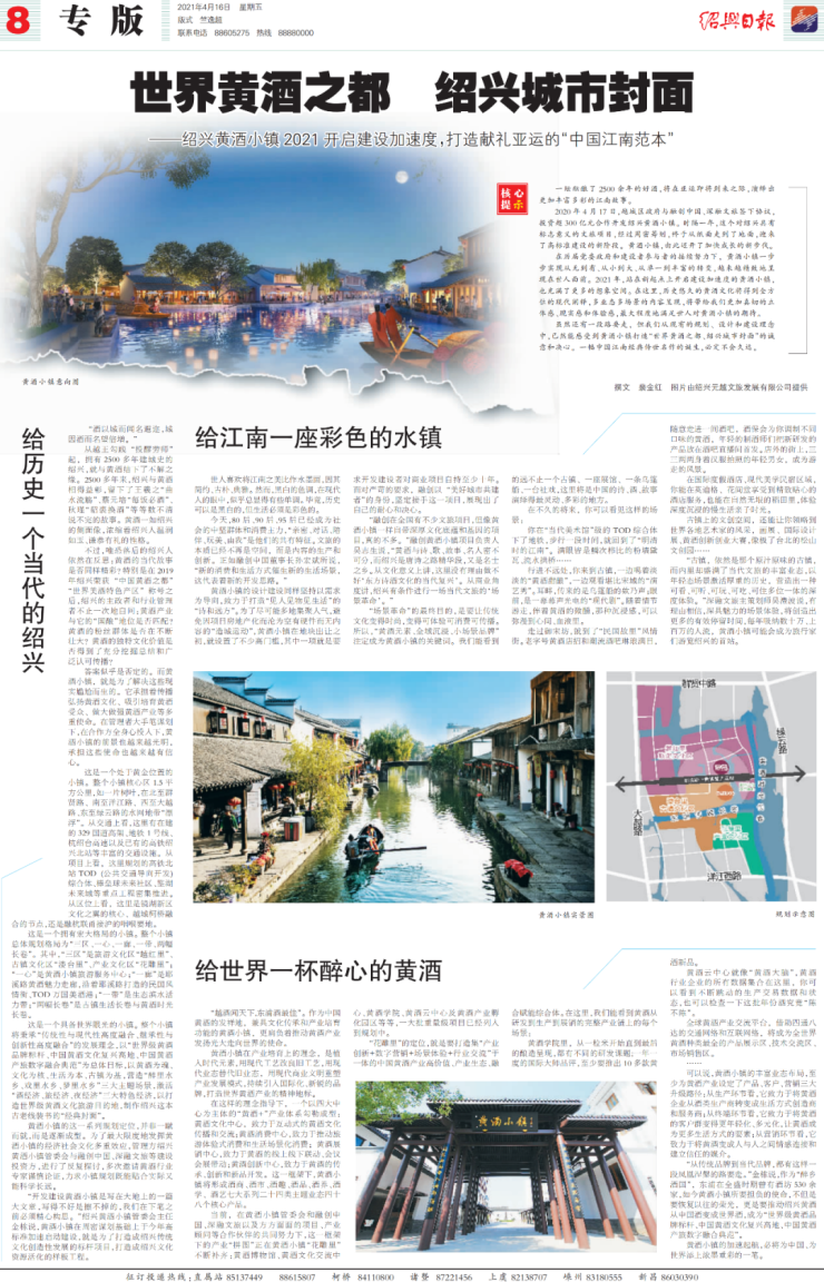2020年4月17日,越城区政府与融创中国、深融文旅签下协议,投资超300亿元合作开发绍兴黄酒小镇。这个对绍兴具有标志意义的文旅项目,在绍兴各界关注之下,经过一年时间的筹备,于2021年开启建设加速度,预备打造献礼亚运的“中国江南范本”。在此之际,绍兴日报专版发布《世界黄酒之都,绍兴城市封面》,对这座小镇进行了深入的解读。