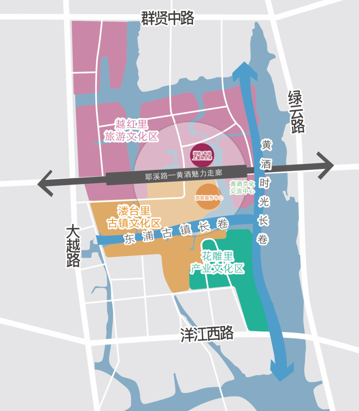 这是一个拥有宏大格局的小镇。整个小镇总体规划格局为:“三区、一心、一廊、一带、两幅长卷”。其中,“三区”是旅游文化区“越红里”、古镇文化区“溇台里”、产业文化区“花雕里”;“一心”是黄酒小镇旅游服务中心;“一廊”是耶溪路黄酒魅力走廊,沿着耶溪路打造的民国风情街、TOD商业中心、万国美酒港;“一带”是生态滨水活力带;“两幅长卷”是古镇生活长卷与黄酒时光长卷。