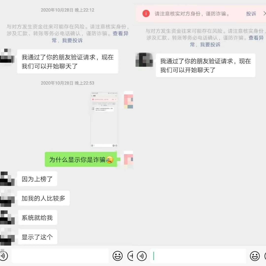 成功加微信之后,秋天发现对方被标记上了“请注意核实对方身份,谨防诈骗”的文字,询问之后,对方回应称,“因为上榜了,加我的人比较多,系统就给我显示了这个。”