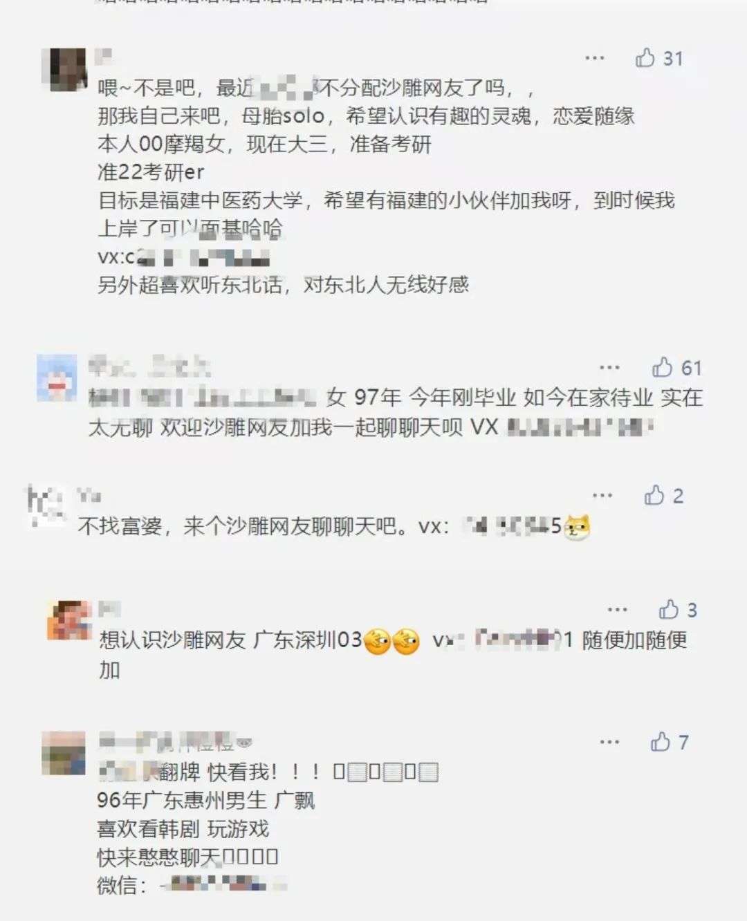 简单的信息,两三行字,也许就能够结下一段缘分。“那时候评论区非常热闹,有很多留言,有交友的,也有找对象的,都会附上自己的微信号。”秋天表示。