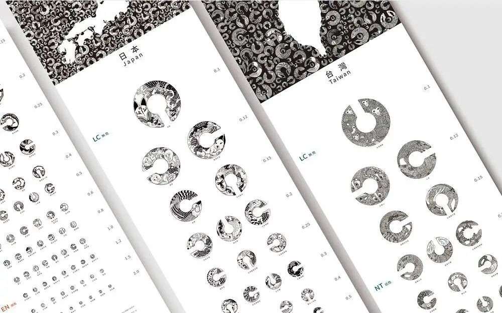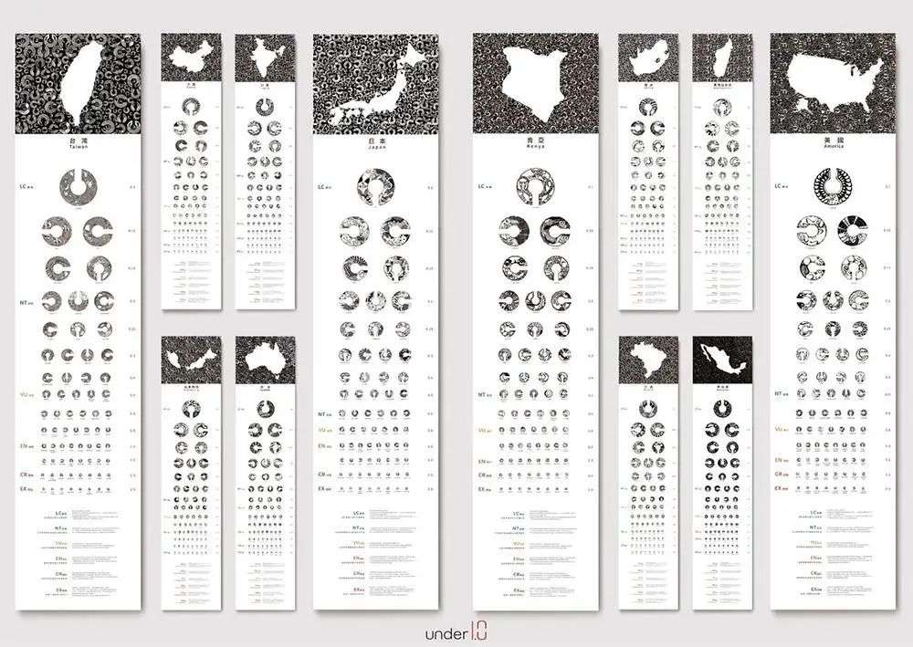 台湾设计师万向欣的作品《Under 1.0》,就是用视力表的概念去打造濒危动物保护的主题。这12份视力表上,涵盖了 12 个国家(地区)的 800 种以上濒危动物。