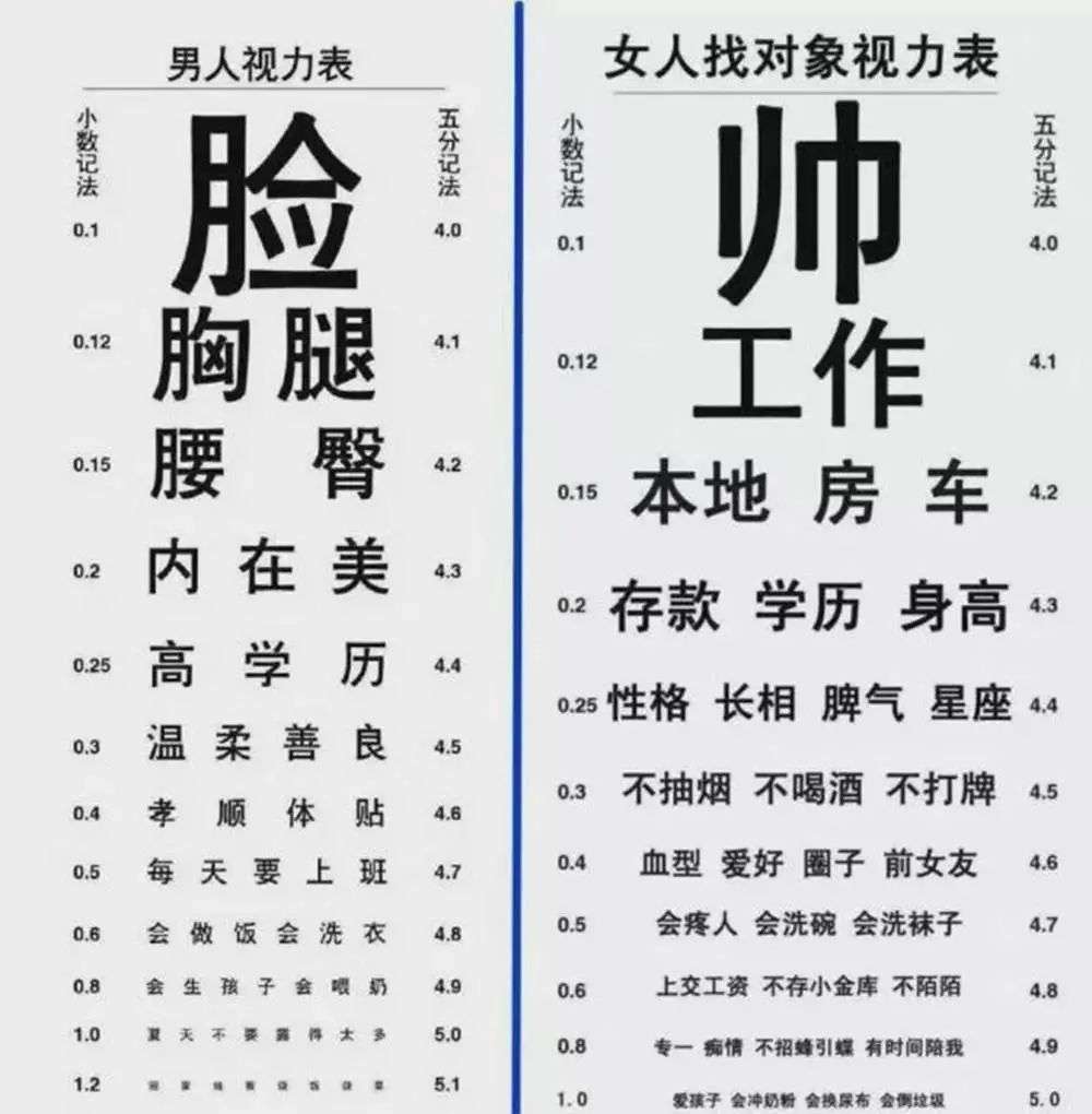 这不是第一份引起热议的视力表,早在几年前,调侃男女找对象问题的视力表横空出世,被各大媒体转发。