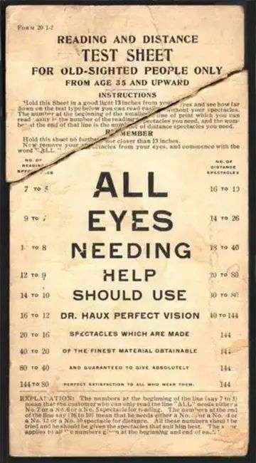 ▲1910 年代眼镜推销员的袖珍型视力表,由完整句子「所有需要帮助的眼睛,都需要使用 Haux Perfect 博士版本的眼镜」组成. 图片来自:美国眼科医学会