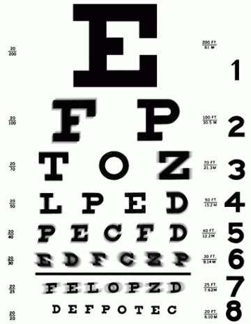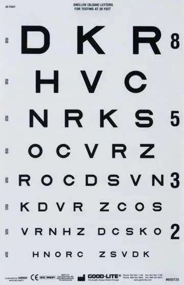 在接下来的 1976 年,澳大利亚视觉研究所的 Ian Bailey 和 Jan E. Lovie-Kitchin 从布局着手,再一次革新了视力表。他们创立的 LogMAR 图表是个倒三角形,每行均有 5 个字母,间距随着字号成比例逐行缩小。