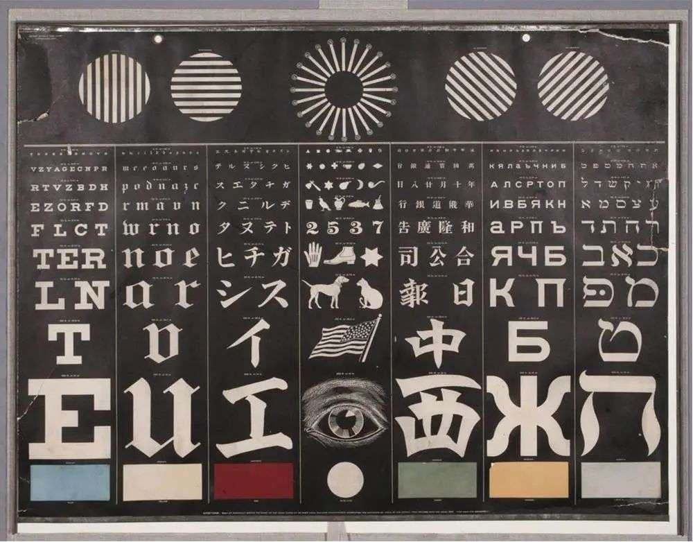 1907 年,旧金山医生乔治·迈耶尔(George Mayerle)设计了一款万国视力表,集聚了各国语言和图像符号,上方有测试散光用的圆圈,下方则是色盲测试区,放了针对铁路和航船的工作人员需要辨认的6种颜色。