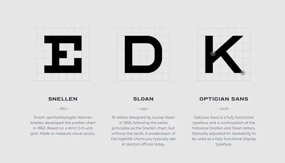 而现在的视力表用的无衬线体,大大降低了字母的识别度,让视力检测更为有效而准确。