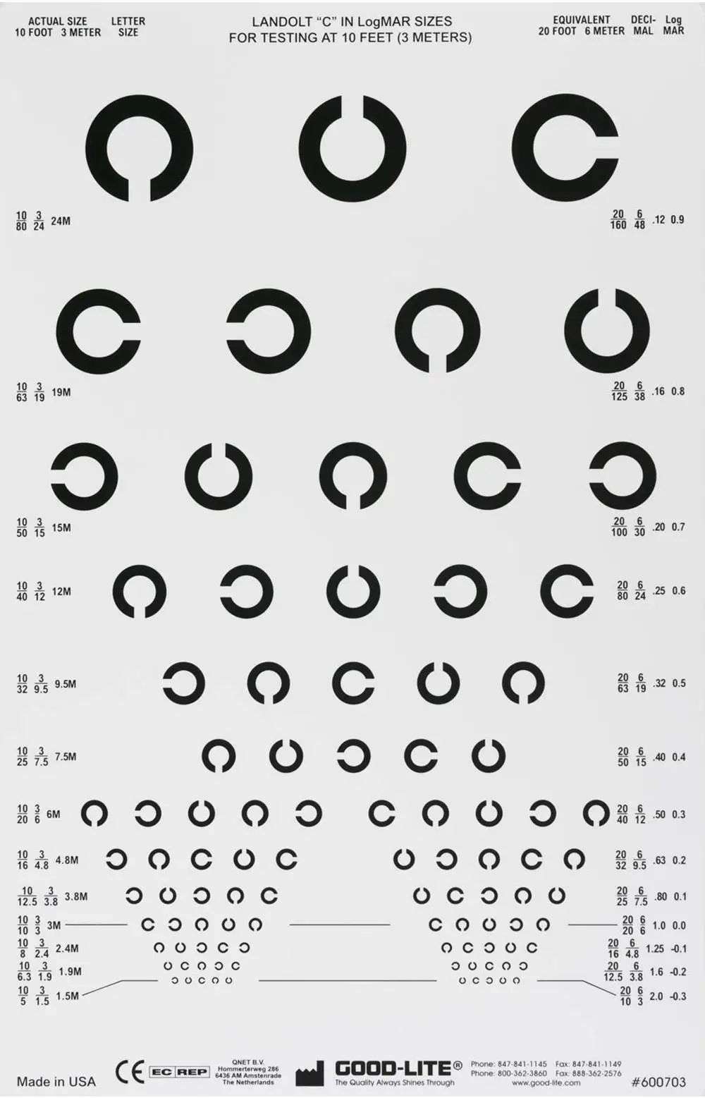 C 字母的笔划宽度和开口宽度,严格等同于字母直径的 1/5。这也意味着,识别 C 方向,仅仅可以靠找到那一个小小的缺口,也难怪在飞行员招收这些重量级场景,E 字表也得让位于戒指表。