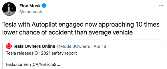 同在周末,马斯克在推特上称「特斯拉自动驾驶安全性是普通车10倍」。