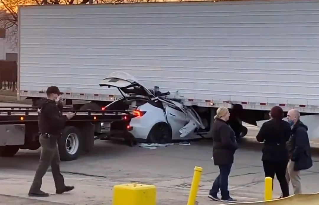 上个月同样是在美国,底特律西南部一个十字路口处,特斯拉Modle Y撞上了一辆白色大卡车,两名乘客当场急送ICU。