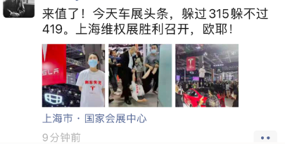 一位参展的业内高管表示,「来值了!今天车展头条,躲过315躲不过419。上海维权展胜利召开。」