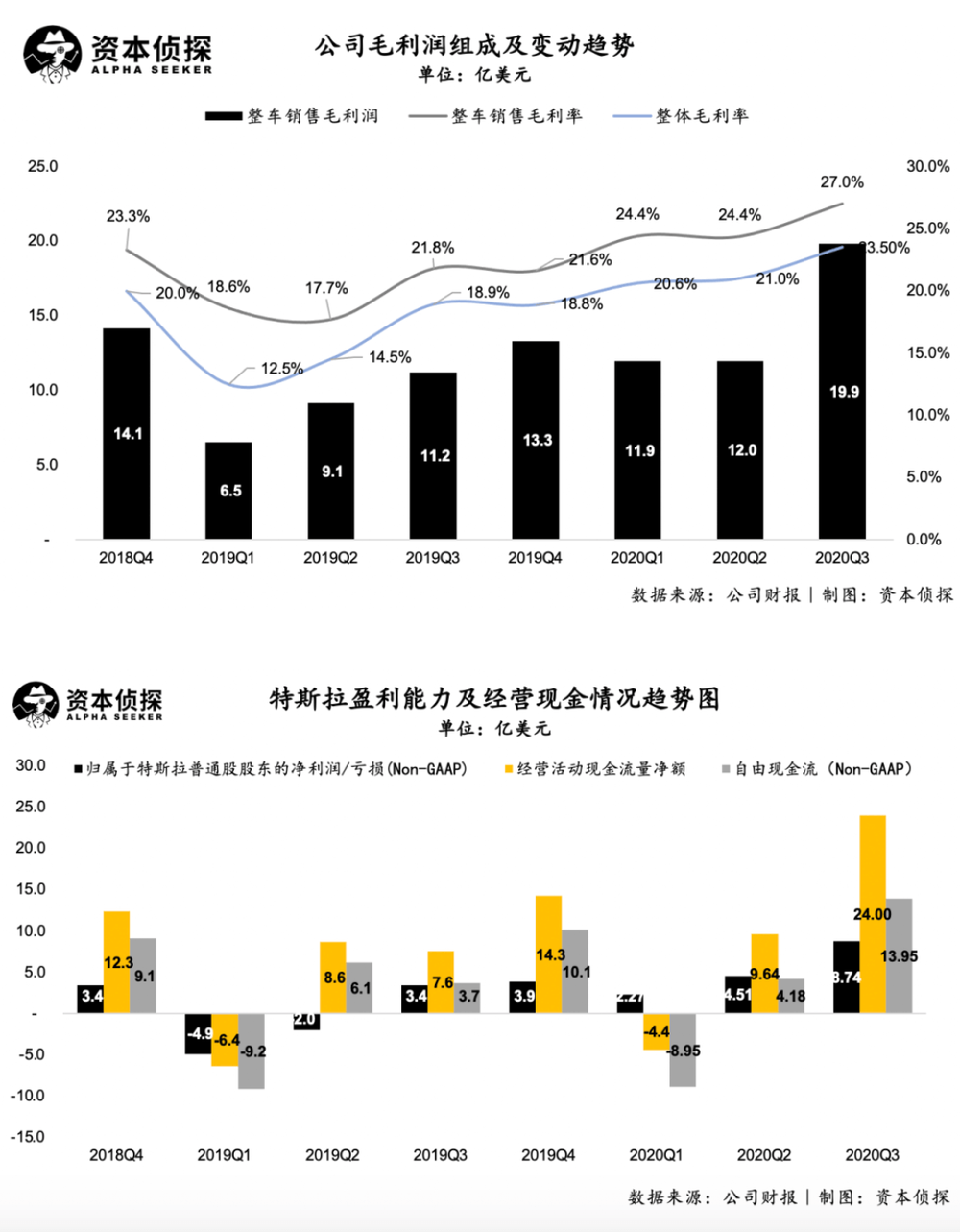 - 三季度,特斯拉实现毛利润20.6亿美元,同比大涨73%,毛利率从去年同期的18.9%提升至23.5%。其中,整车销售毛利率从21.8%提升至27.0%。