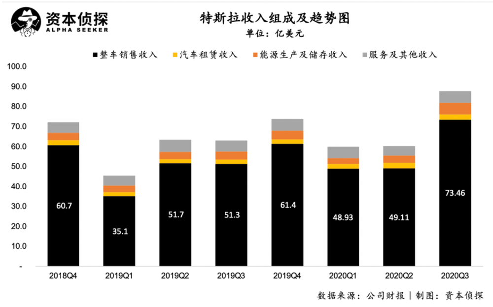 特斯拉降低平均车单价、扩大销量规模的思路取得了效果,三季度其营业收入同样实现了较大幅度的上涨:总营收达到87.7亿美元,同比增长39%;其中,整车销售营收为73.4亿美元同比增长43.1%。