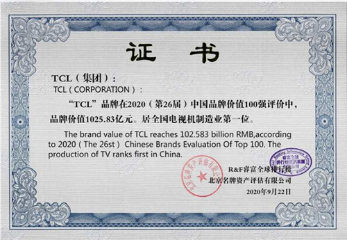 日前,睿富全球排行榜资讯集团与北京名牌资产评估有限公司共同进行的2020(第 26 届)中国品牌价值 100 强研究报告显示:TCL品牌以1025.83 亿的品牌价值位列总榜单第八位,居全国电视机制造业第一位,再一次印证了TCL的品牌实力。