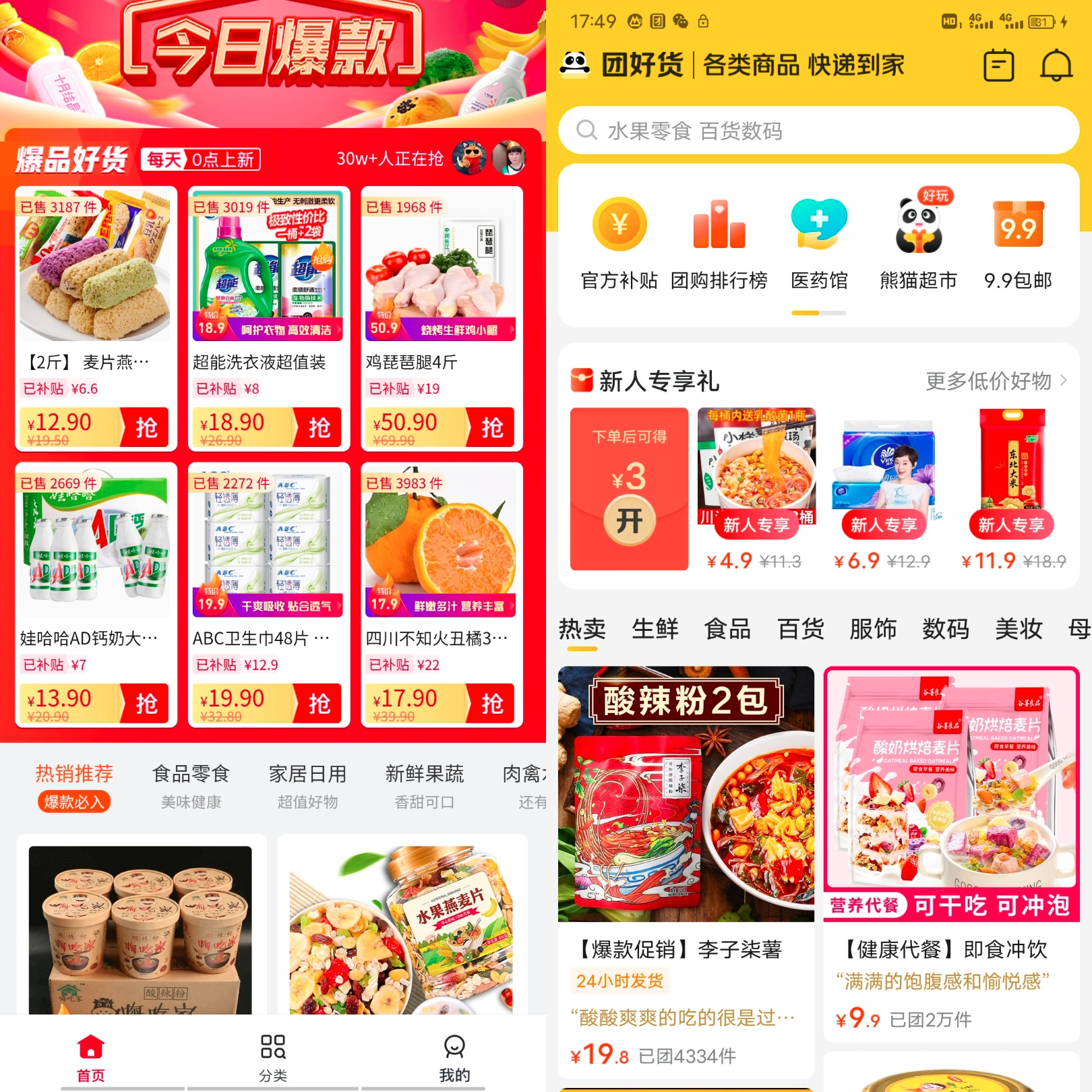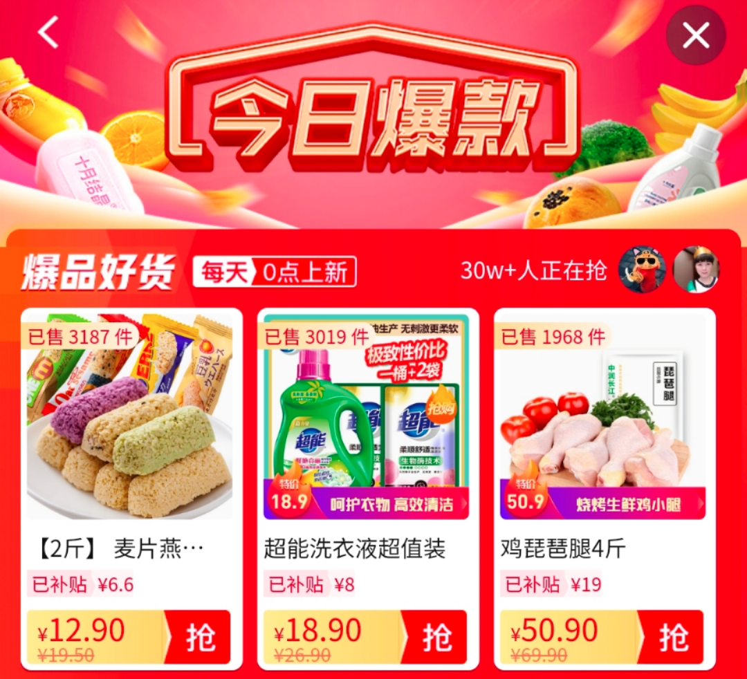 目前,“今日爆款”的商品种类涵盖了新鲜蔬菜、水果、粮油、百货、数码、母婴、家用电器等,多为生活类的商品。