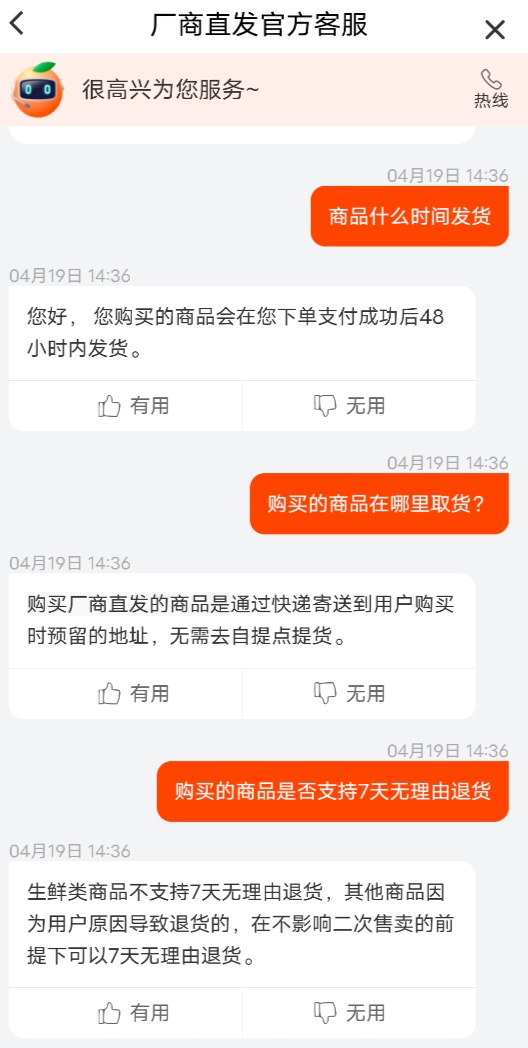 当前,“今日爆款”的售后由橙心优选提供,客服会介绍基本的购物规则,例如除生鲜类商品外,其他商品因为用户原因导致退货的商品,在不影响第二次售卖的前提下可以7天无理由退货。