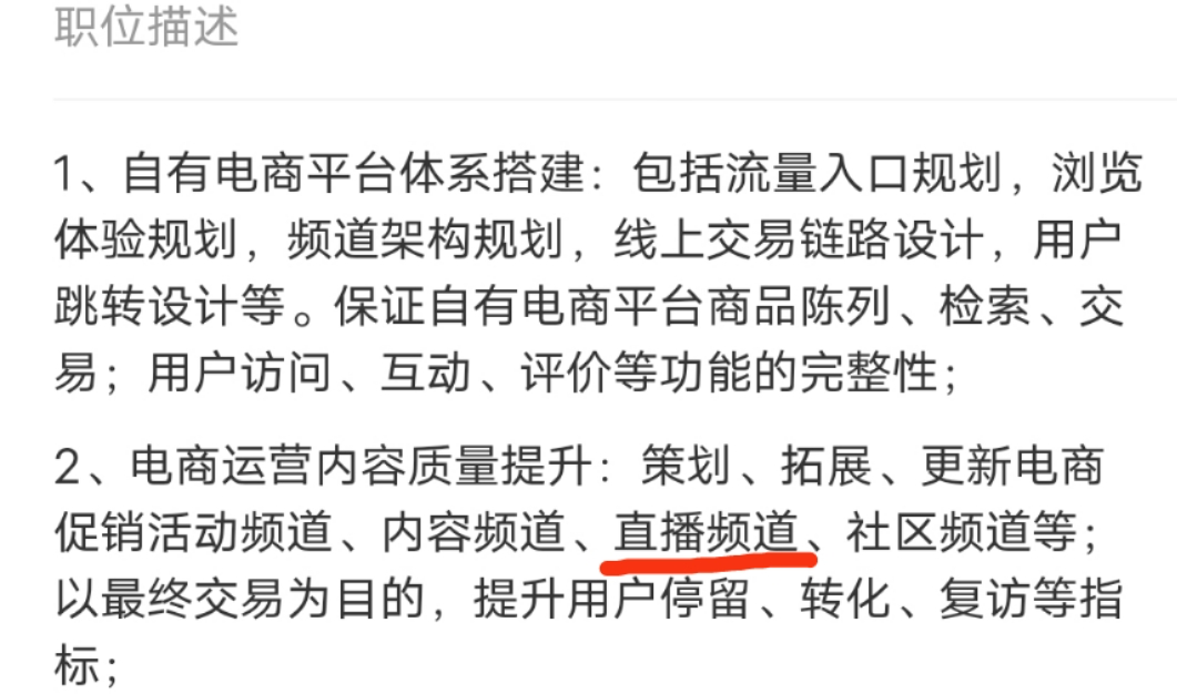 值得注意的是,在滴滴的招聘官网中可以看到,滴滴从今年3月开始,就在招聘多个电商的岗位,其中,对于“自营电商高级经理”的职位描述中,还提及了“直播频道”,这预示着滴滴正在规划“直播电商”等内容功能,加强对电商业务的流量获取,扩充变现渠道。