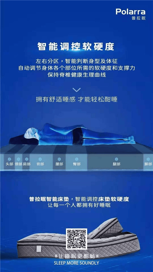 例如2012年诞生的新锐智能床垫品牌——普拉眠,就能自动根据你的体型,智能分段调节床垫的软硬。在你觉得舒适的情况下,给予身体各部位最大的呵护承托。让你不用千挑万选,也能找到最适合你的床垫。