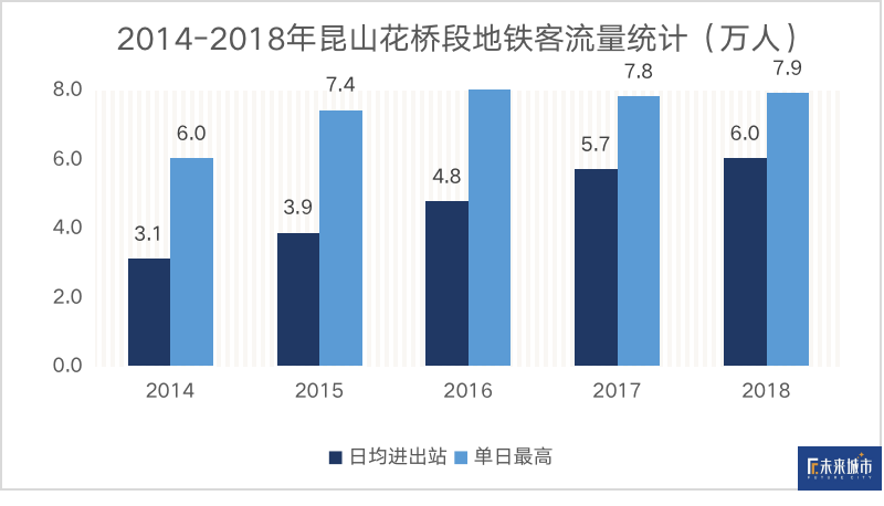 昆山线开通以来,客流量持续上涨。2014-2018年,花桥段地铁日均进出站人次翻了一倍,2019年这段地铁客流量突破了一亿人次。上海昆山线承载着沪漂的梦想,每天输送着超过6万人往返于沪苏两地,也悄然带动着“中国第一强县”昆山。