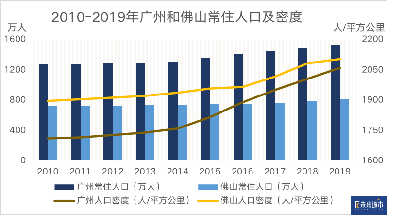 “超级城市圈”也为两座城市吸引了无数优秀人才。2019年,广州、佛山常住人口总计达2346.5万,新增人口分别达到40.2万和25.3万人,位列广东省第二、三名。佛山更是在广州的辐射下人口密度稳步提升,坐享人口红利。