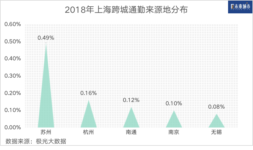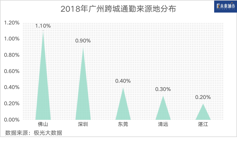 极光大数据研究表明,2018年,广州的跨城通勤人群占比约6%,在全国排名第一。其中,佛山是广州最大的跨城通勤来源地,占比达1.1%。
