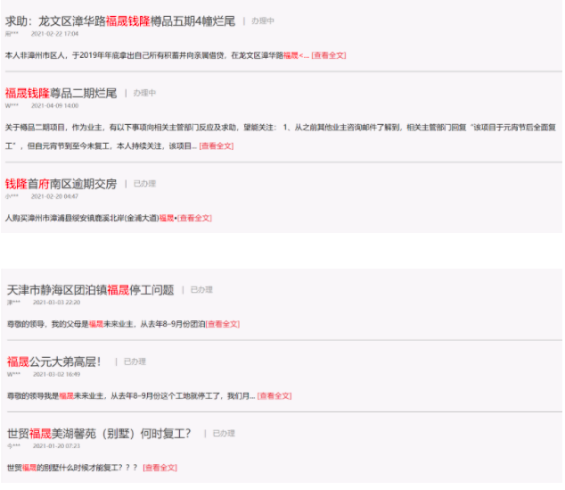 不过今年以来,在人民网领导留言板上,福晟旗下位于天津、漳州等地的楼盘项目仍频遭业主投诉,存在“延期复工”和“无法交付”等问题。