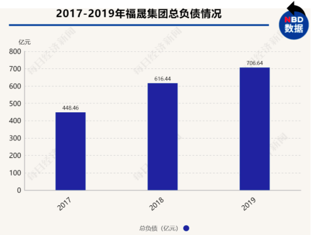 2017-2019年,福晟集团总负债分别为448.46亿元、616.44亿元、706.64亿元,负债规模持续上涨。