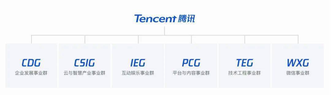 企业发展事业群(CDG)、互动娱乐事业群(IEG)、技术工程事业群(TEG)、微信事业群(WXG),这四个事业群保留;