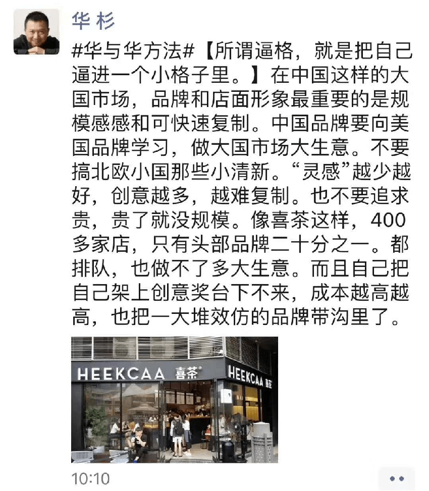2020年四月末,蜜雪冰城营销服务商“华与华”的老板华衫在朋友圈点名喜茶,很快喜茶创始人兼CEO聂云宸引用自己之前的言论称“有些人总是很自信的回答他们并不了解的问题”。