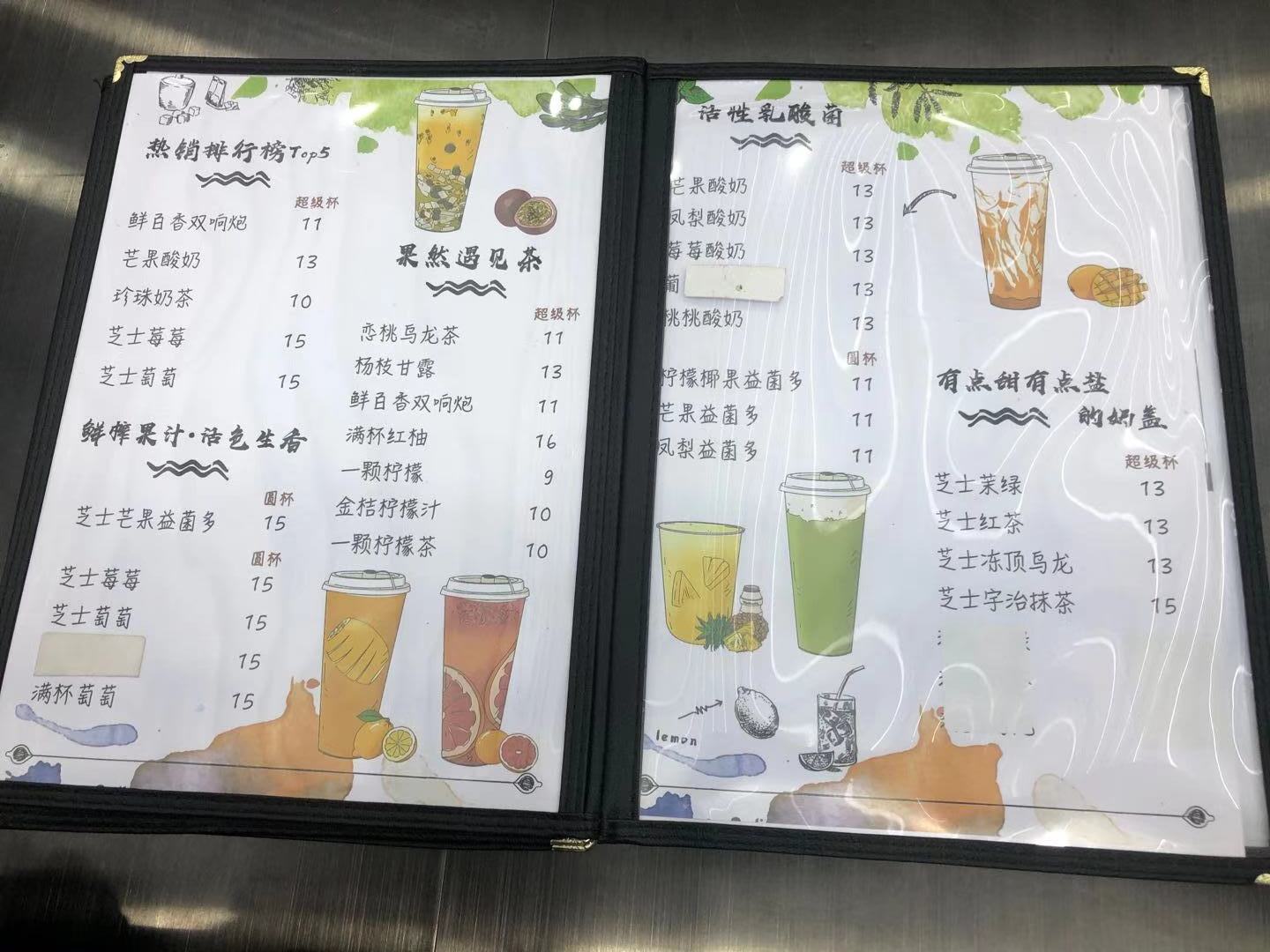 饮品的调配和款式作为一种饮食文化,太容易受到“流行”的影响。梁萧在外地上大学时在餐饮行业兼职,毕业后在某知名台湾奶茶品牌的门店里工作过一段时间,所以当自己回老家开始创业后的初始菜单就多少应用了自己先前的工作经验。