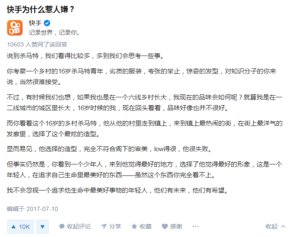 快手也从那一年走出“污名化”。那一年随着手工耿、giao哥、冬泳怪鸽的出圈,“看到六环外的世界”、“在短视频里读懂中国”开始取代“娱乐至死”、“奶头乐”,成为了短视频行业里自用户到创业者都认同的核心价值观。