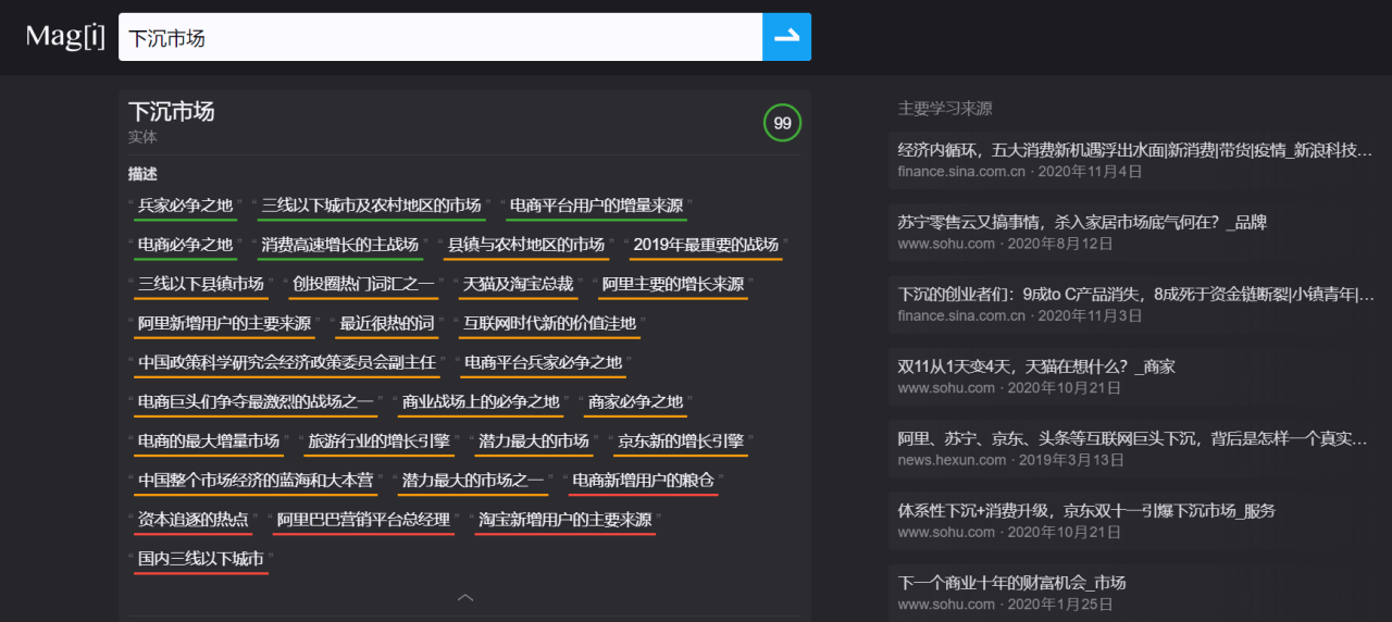 (在知识图谱magi搜索“下沉市场”得到的结果)