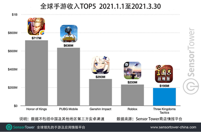 据今年4月 Sensor Tower 发布的数据报告显示,《三国志・战略版》在全球 App Store 和 Google Play 的预估总收入已突破10亿美元大关。凭借这一成绩,《三国志・战略版》也跻身全球手游收入 TOP5。