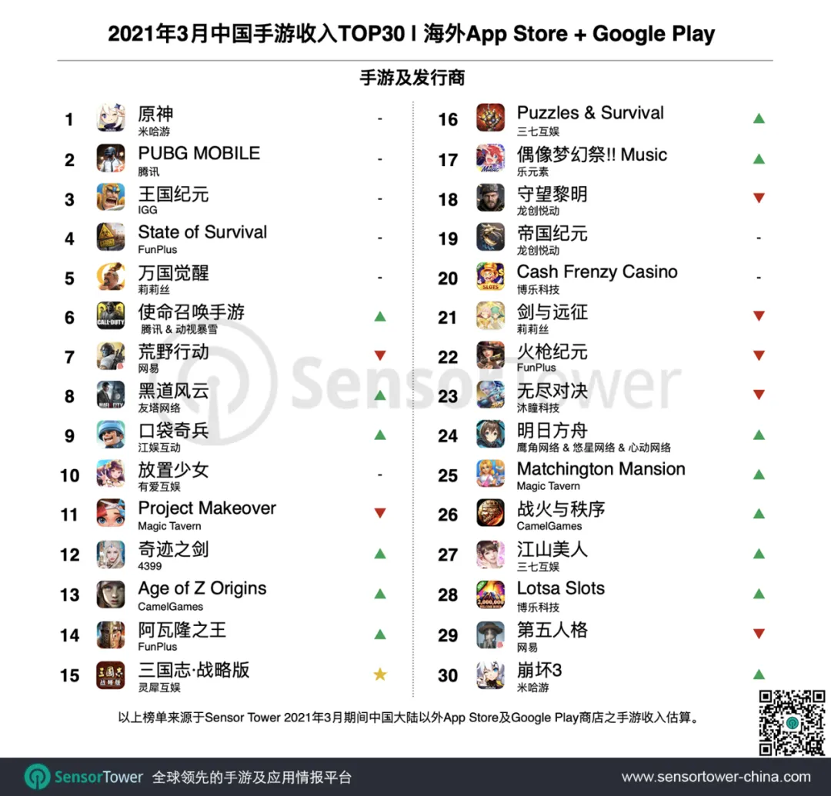 在坐稳国内 SLG 冠军宝座后,《三国志・战略版》不断在海外市场攻城略地,突破品类出海成绩的天花板。得益于在港澳台与韩国市场取得的不俗成绩,《三国志・战略版》在 Sensor Tower 发布的2021年3月中国手游产品出海榜单中排进前15名。