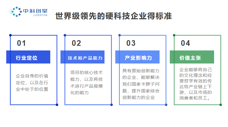 第三个是领先的全球产业影响力。中科创星要投的领域是硬科技,具有原始创新能力的企业,找到和成就这些硬科技冠军企业、潜在的隐形冠军企业,能够解决我们国家卡脖子问题,提升国家综合创新能力的企业。