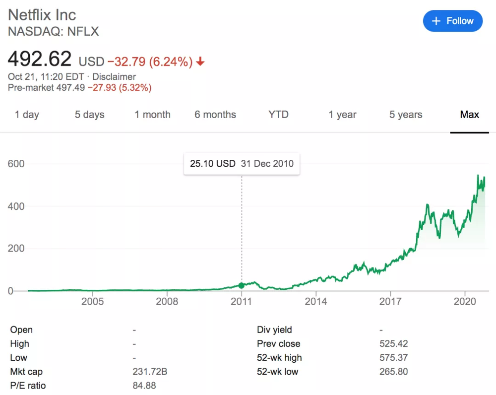 粗略估算,如果10年前购买1千美元Netflix的股票,今天价值约为9万美元。如果你错失了这支股票,第二选择可以是它的会员,因为其价格涨幅也不容小觑。