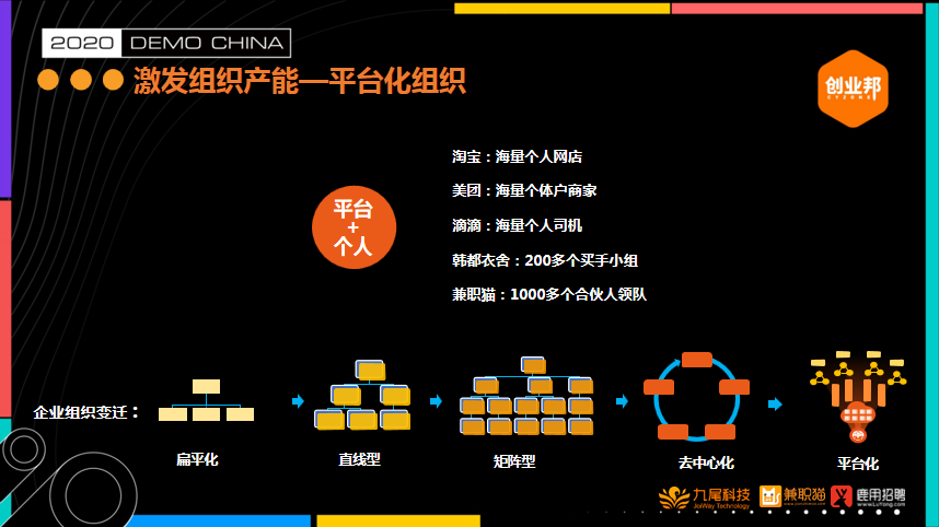 从共享单车大战以及外卖大战,那时的上百个竞品只剩下2、3个。所以企业怎样实现组织平台化,利用赋能实现企业的快速增长,是我们接下来要关注的重点。