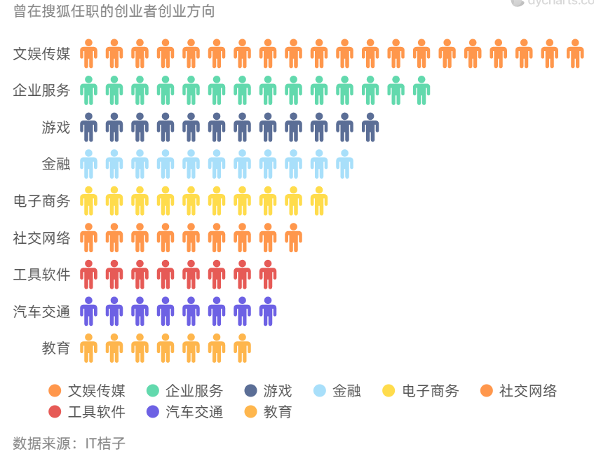 根据 IT 桔子数据,曾在搜狐任职的创业者选择的创业方向前三名是:文娱传媒、企业服务和游戏。