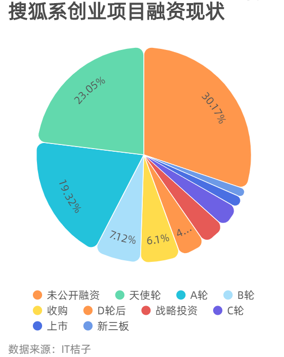 从融资情况来看,30% 的搜狐系创业项目无公开融资记录;另有接近一半搜狐系项目获得早期投资,其中 23% 获得了天使轮融资,19% 获得了 A 轮融资,7% 获得了 B 轮融资;有 6% 的项目被并购,另有 14% 的项目获得了 B 轮后的融资。