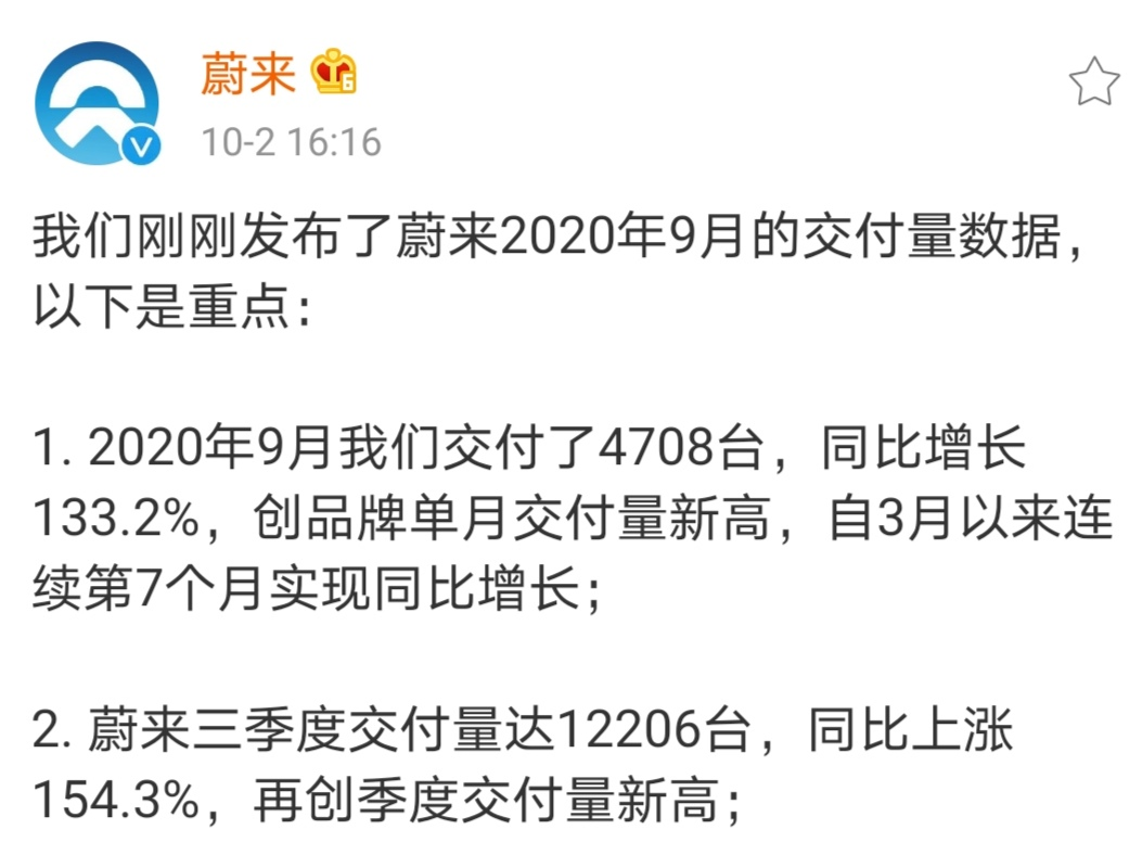 整个三季度,蔚来交付了12206辆汽车,同比增长154.3%,超出了该公司季度指导的上限。此前公司预计,2020年第三季度,其汽车交付量为1.1万-1.15万辆。