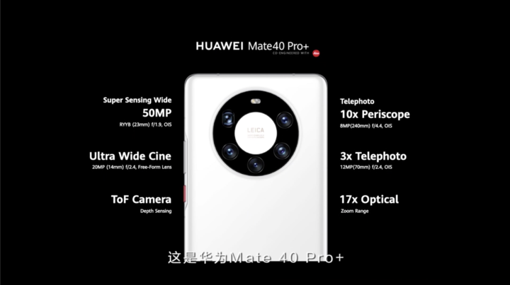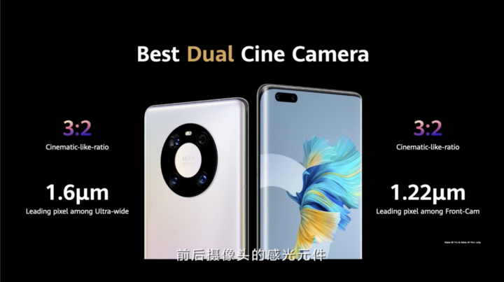 后置方面依然是光环设计,和 Mate40 一样是三摄,但规格有所不同。主摄还是 5000 万像素的 IMX700 RYYB 传感器。另外两颗摄像头则有所升级,一颗是 2000 万像素电影镜头,具备出色的抗广角畸变算法。另一颗则是 1200 万像素的潜望式长焦镜头,具备 10 倍混合变焦能力,最后同样还有一颗激光对焦模块。