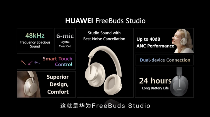 我们先来说一说全新的产品线华为 FreeBuds Studio。这是一款头戴式降噪耳机,华为称其动态降噪技术,可以让它准确识别和判断外界声场环境变化,自动在轻度、均衡、深度三种高自适应性降噪模式间切换。